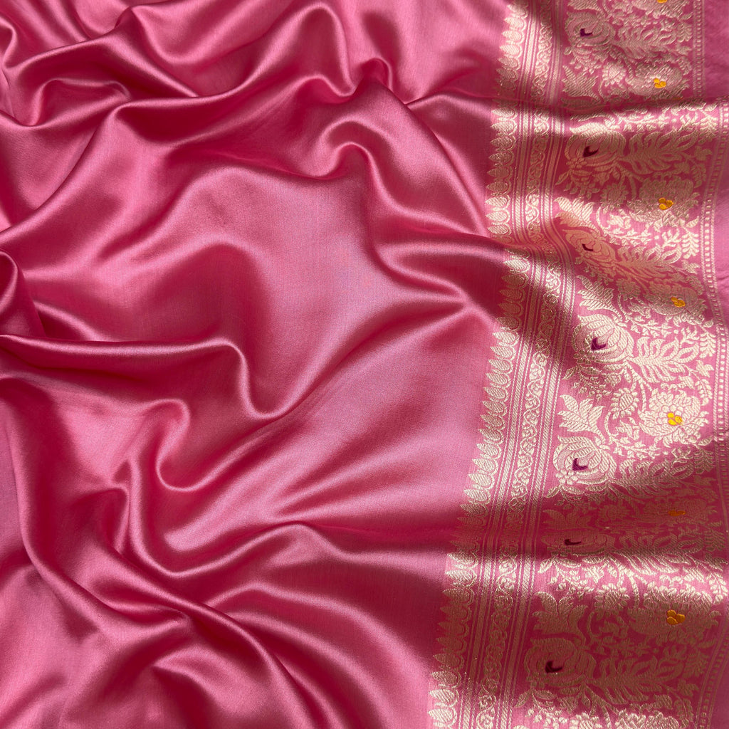 Pure kora handwoven fully kadwa all over gold zari and multicolour resham meenakari alfi bootas and gold zari with meenakari, designer rich border and pallu weave very much exclusive piece of Banarasi Saree