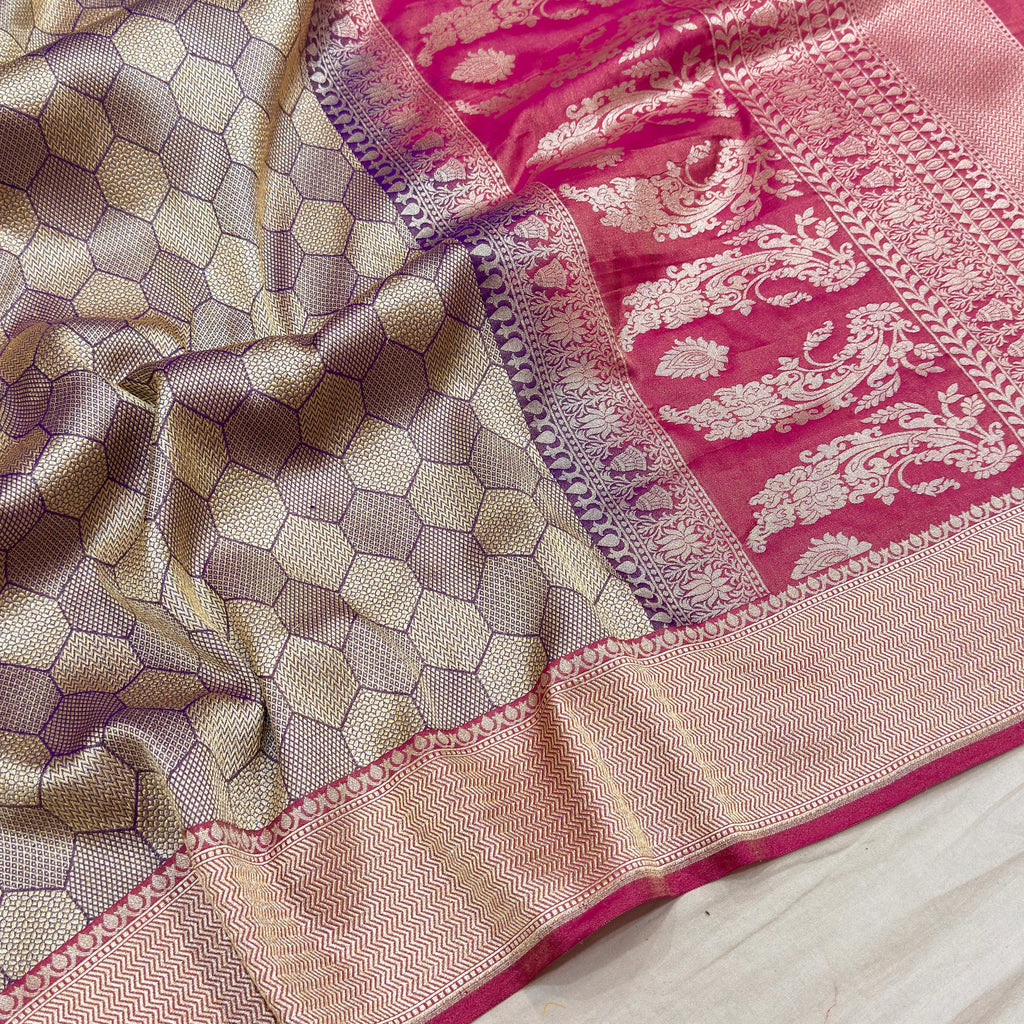 Pure tissue silk Handwoven all over silver and gold together twisted zari tanchoi geometric motifs on base with same zari rich border and pallu weave very much exclusive piece of Banarasi saree