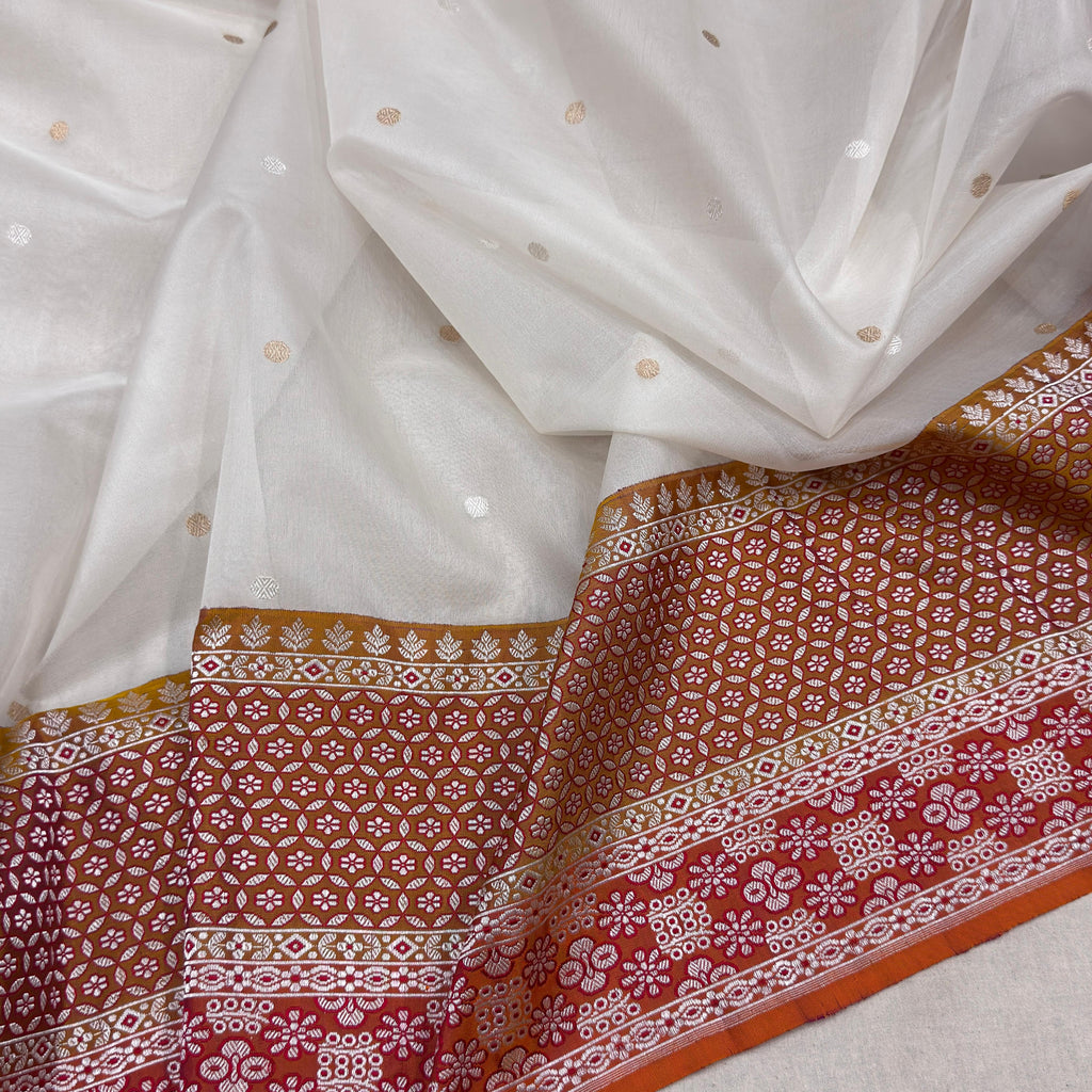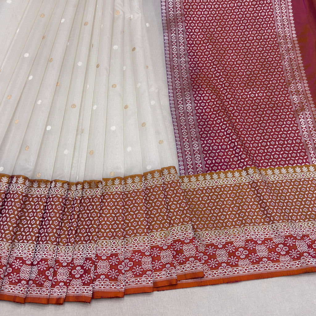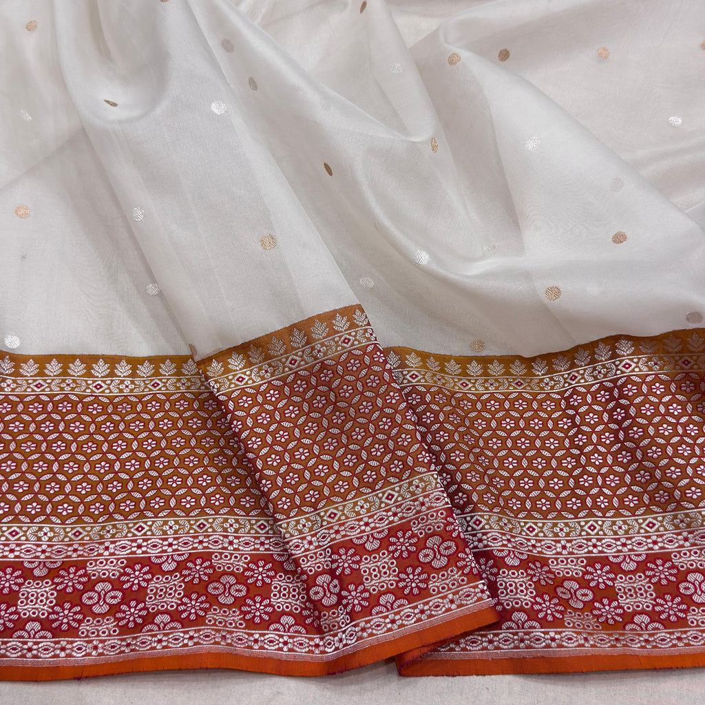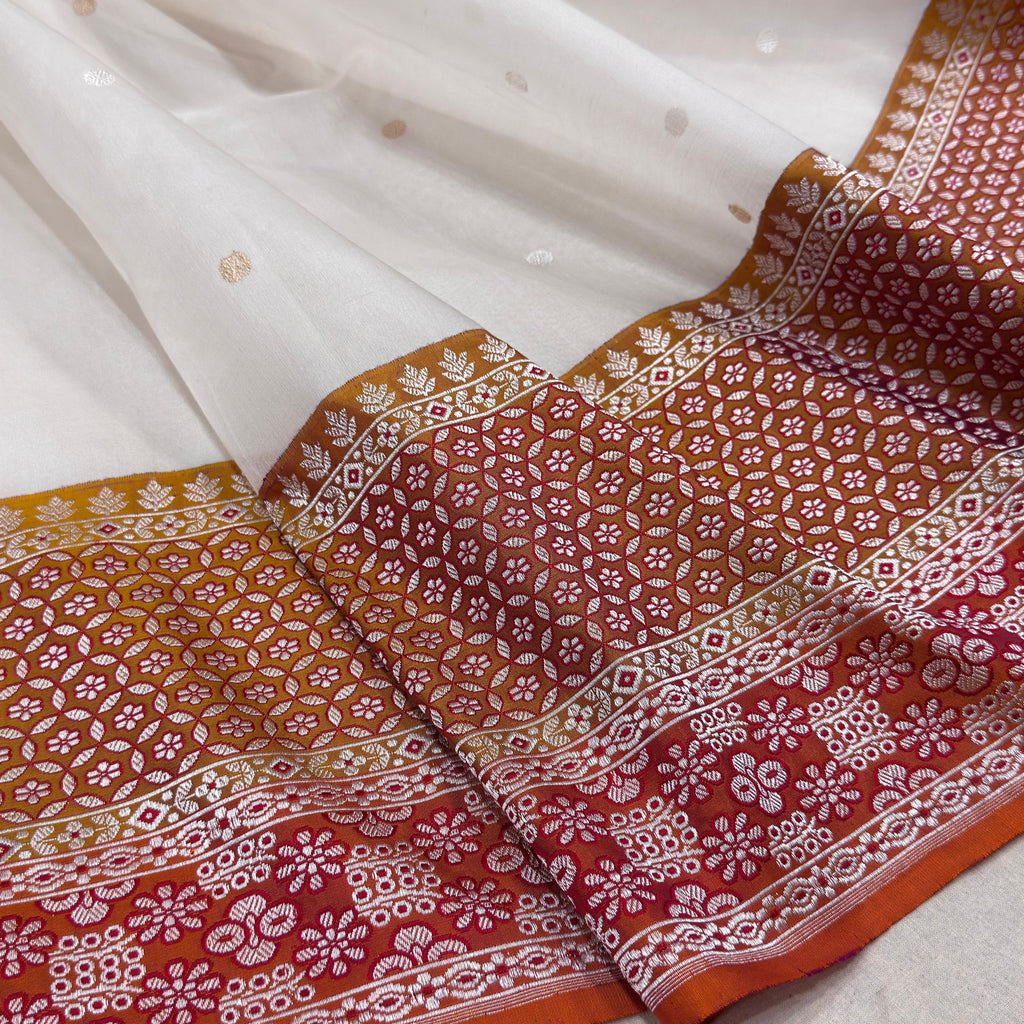 Pure kora handwoven fully kadwa all over silver and gold zari booties with designer 2 color (mustard & red) base of the border and border motifs has alfi (silver & gold zari), pallu alfi (gold zari and resham) design weave very much exclusive piece of Banarasi saree
