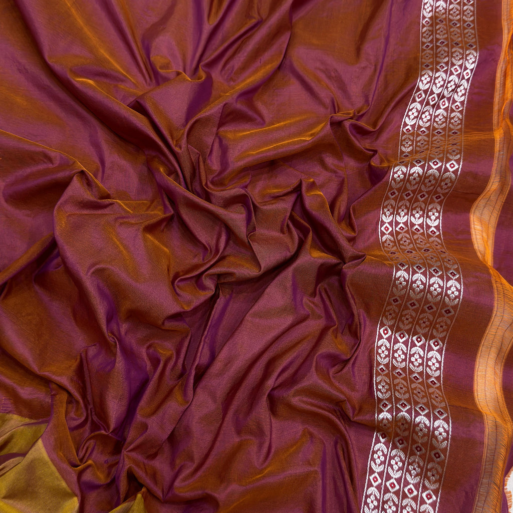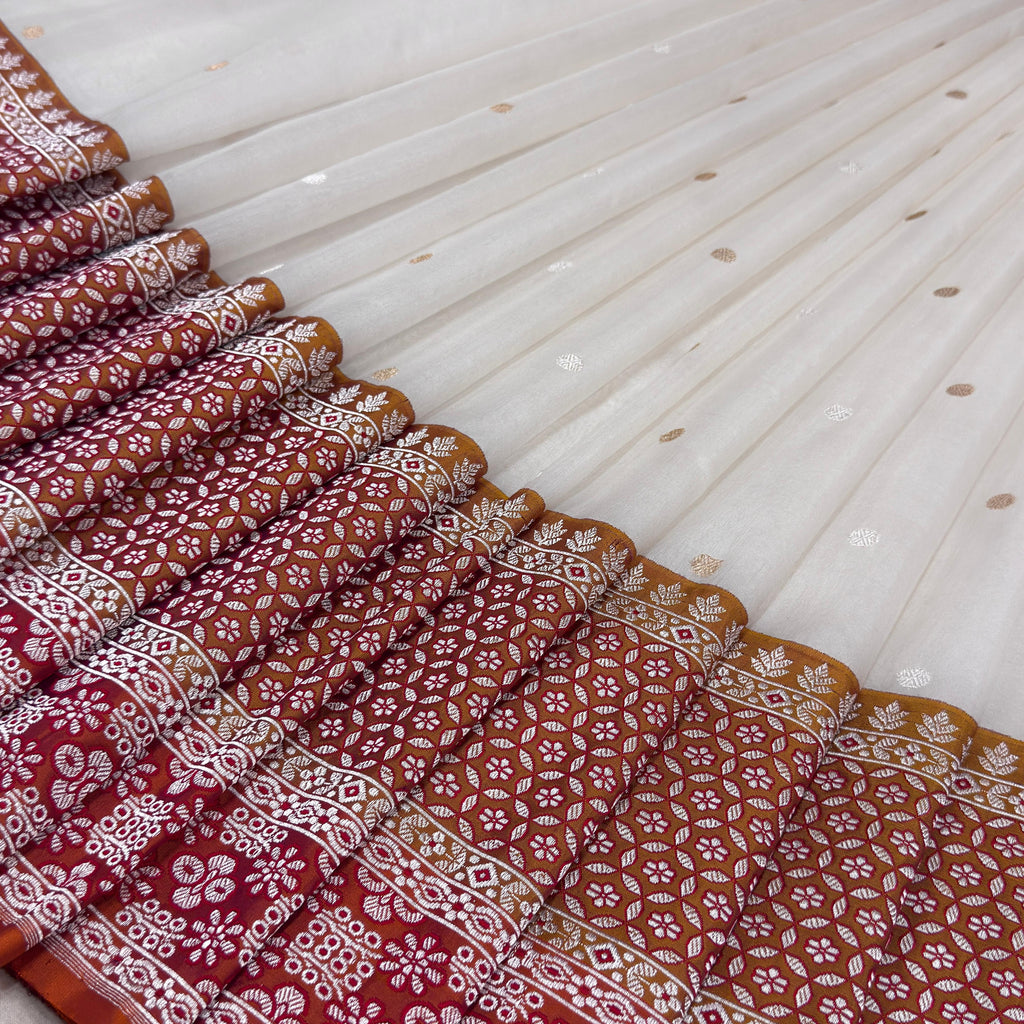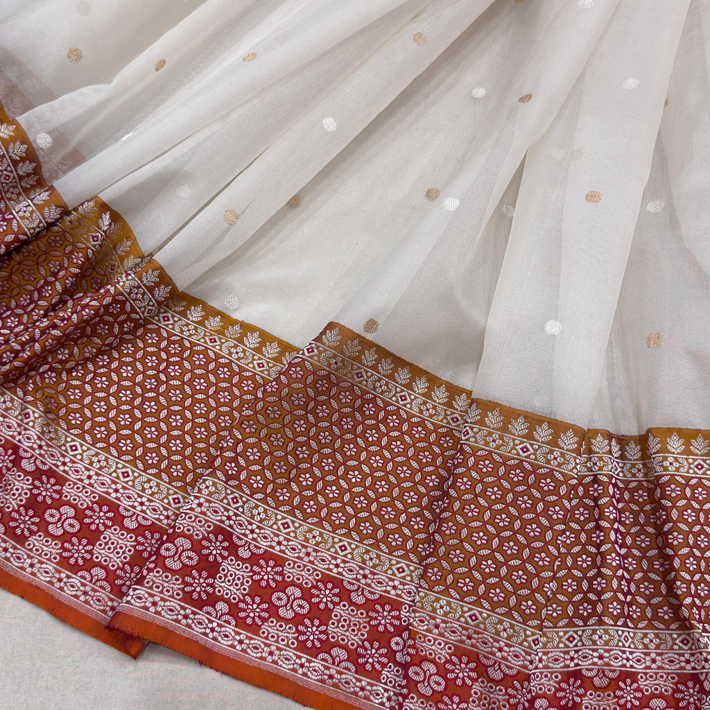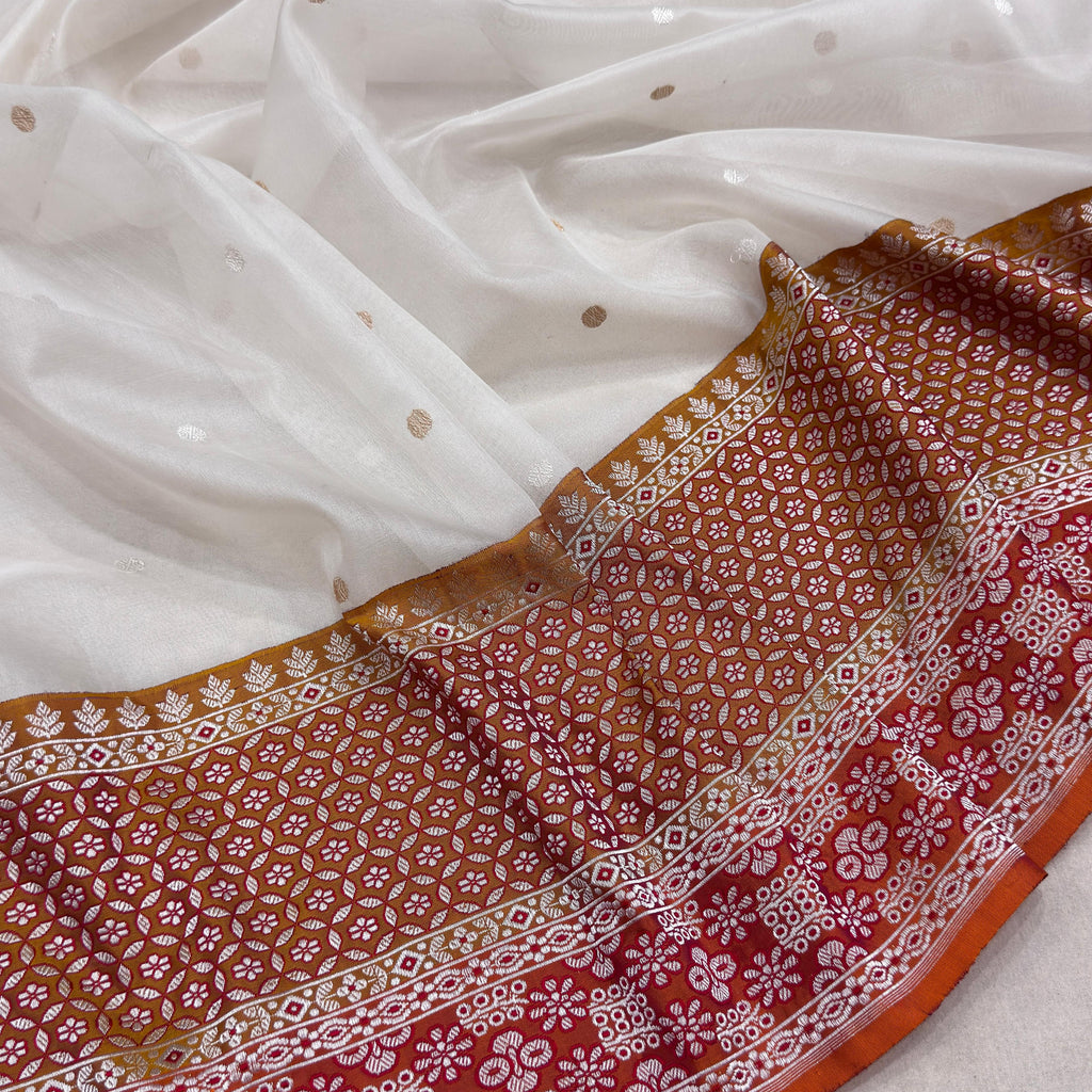 Pure kora handwoven fully kadwa all over silver and gold zari booties with designer 2 color (mustard & red) base of the border and border motifs has alfi (silver & gold zari), pallu alfi (gold zari and resham) design weave very much exclusive piece of Banarasi saree